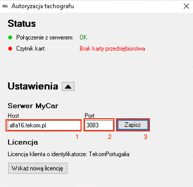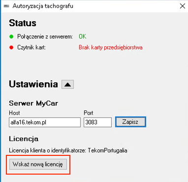 Dane konfiguracyjne od TEKOM – adres serwera oraz plik licencji.