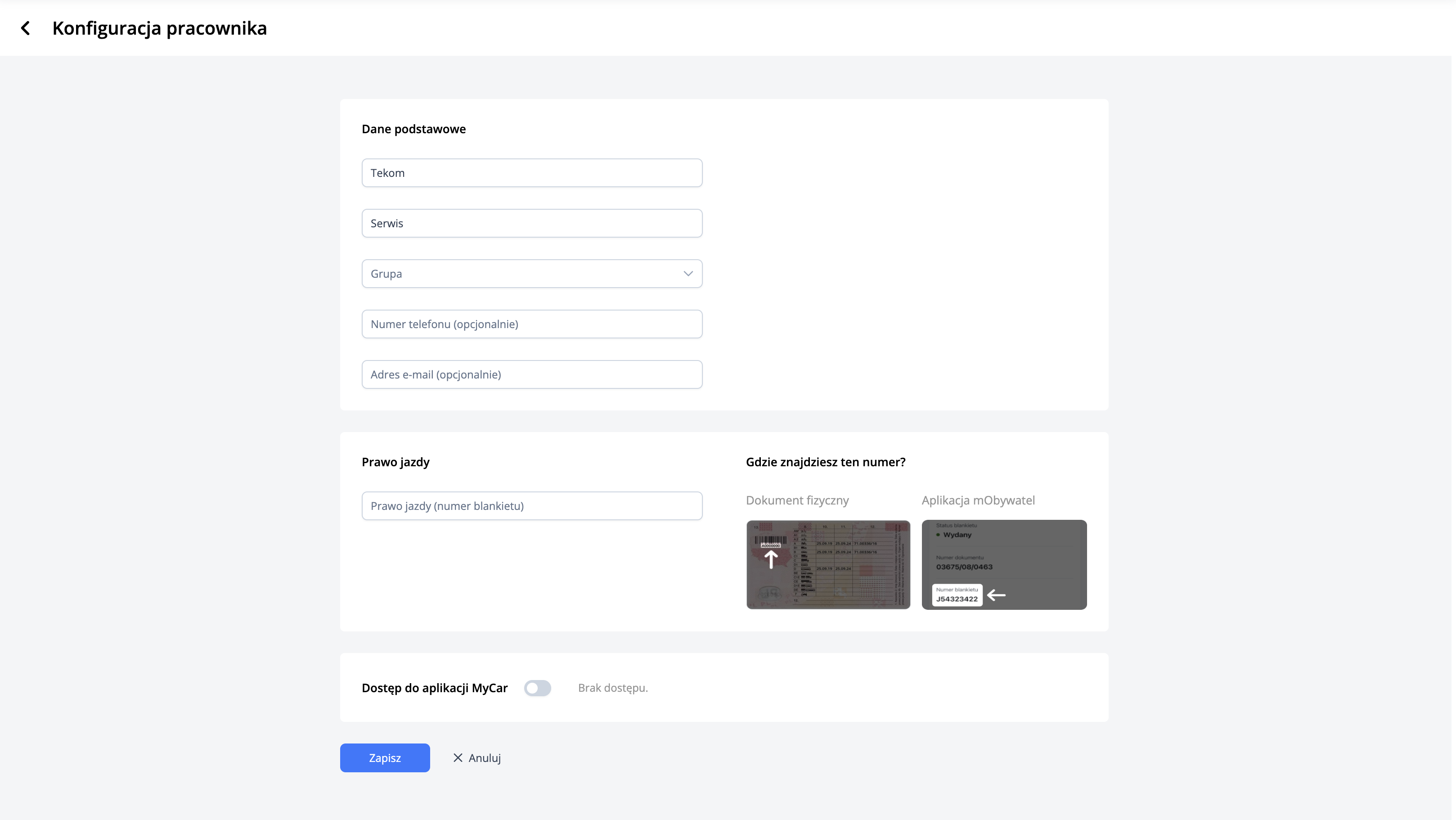 Niżej możesz również wprowadzić numer blankietu prawa jazdy kierowcy - jeżeli posiadasz integracje z CEPIK system będzie sprawdzać czy Twój pracownik ma ważne prawo jazdy.