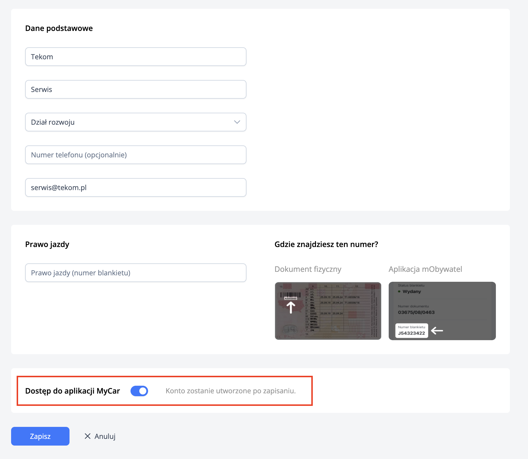 zaznacz opcję Dostęp do aplikacji MyCar oraz zapisz zmiany.
